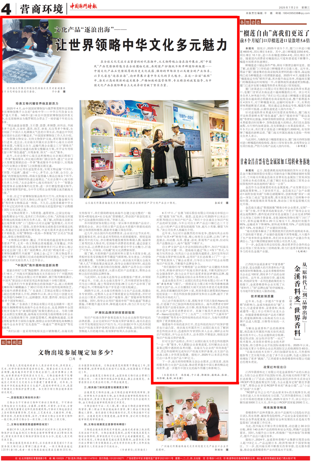 在全球文化交流日益紧密的时代浪潮中,从文物跨越山海在海外展出,到“中国风”产品凭借独特魅力在全球圈粉无数,再到国产IP潮玩不断开辟国际新版图……中国文化产品正凭借深厚的历史文化底蕴、强劲的市场活力以及健全的产业体系,以多元姿态“逐浪出海”,向世界展示着中华文化的多元魅力。在这一壮丽“航程”中,海关以高效便捷的通关服务、严格细致的监管保障、专业精准的政策指导,为中国文化产品在国际舞台上大放异彩贡献了坚实力量。